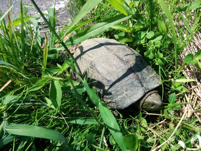 今週畑に行く時に3回カメを見ました。たまにも自転車で旅行をする人を見る、歩いて旅行をする人も見ます。ノンビリのカメと旅行をする人は羨ましいです。