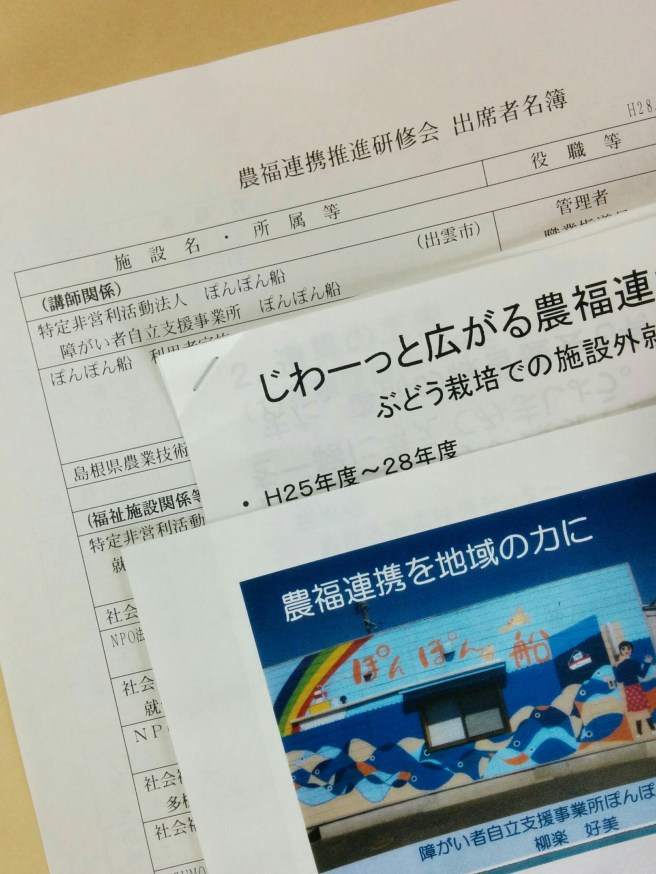 研修会 2016-10-052016-10-05 ~ epimiento 10月4日に島根県農業技術センターで障がい者と農作業に関すれ研修会がありました。ぽんぽん船さんの経験、特にブドウの作業の発表がありました。色んな人を参加した。 私が利用者の家族の話をがとても感謝しました。ステキな人も会いました。 共有: クリックして X で共有 (新しいウィンドウで開きます) X Facebook で共有するにはクリックしてください (新しいウィンドウで開きます) Facebook いいね 読み込み中…