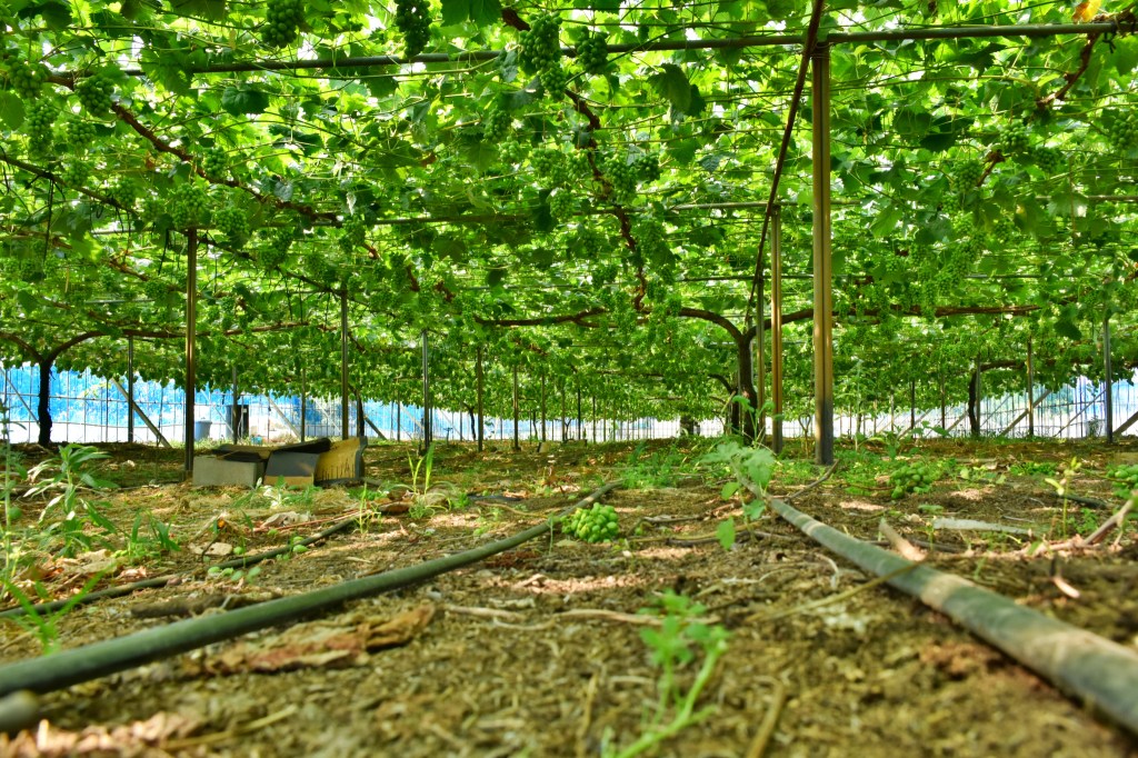 シャインマスカットの二番目の畑で作業をしました、今日は暑かったです。陰祭と風のあかげでは外より涼しくなります。