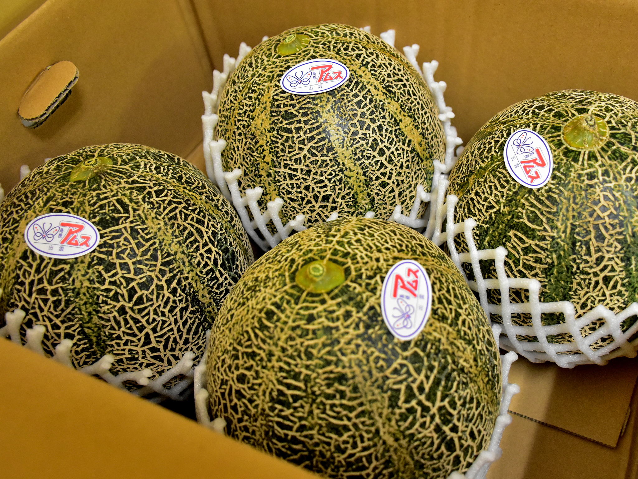 神話の郷ぶどう直売所では今週から島根県産アマスメロンを販売しています。2玉と4玉入箱があります。 アムスメロンはとても美味いです。このメロンはハウス栽培のものです。