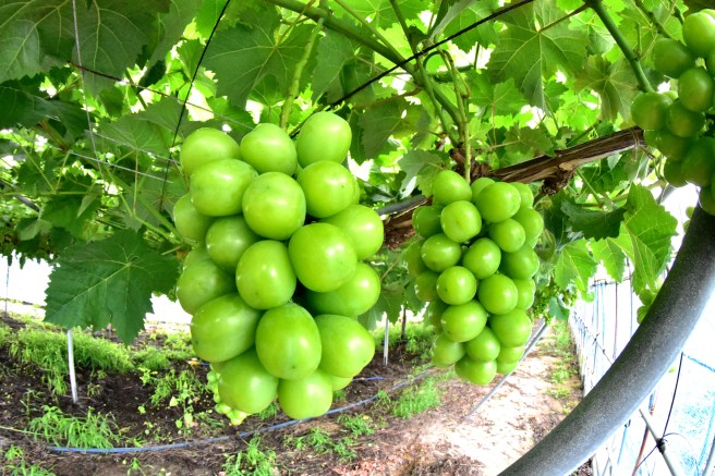 雨よけ栽培のシャインマスカットは水回りの時期です。シャインマスカットは満開から50日後果実が柔らかくなりますと熟成が開始です。その時に仕上げ摘粒をやります。いらない粒を落とします、粒を動かします、きれいな房を作るために。顆粒が収穫まで大きくなります。