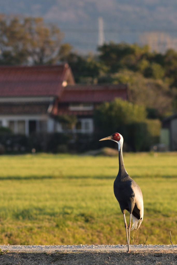 加温栽培のシャインマスカットのハウスの近くに川があります。川の周りは田んぼが多くて家が少ないです。冬鳥が沢山見られます。天気が良い日、帰る時によく見ると大きな鳥がいました。一羽のマナヅルでした「white-naped crane」。この鳥は絶滅機種です。
