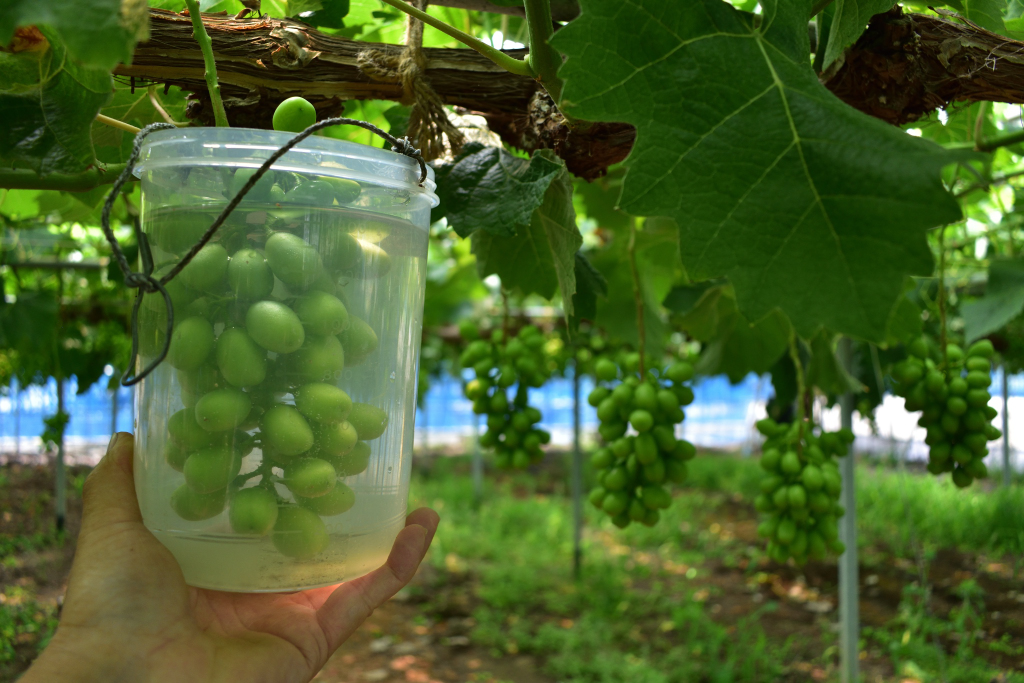 100円で買った容器を使って雨よけ栽培のシャインマスカットのジベレリン処理後をしました。ちょっと遅れたから房が大きくなりました。容器が重たくて手が疲れたので、交代で両手を使いました。古い針金でフックを付けました。