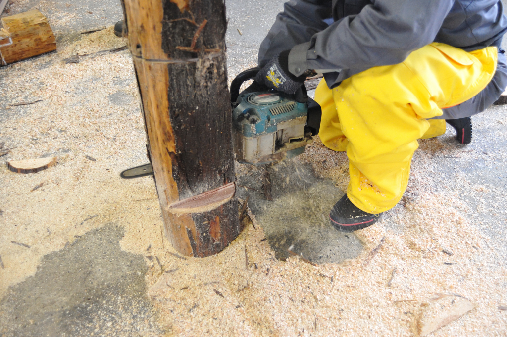 直径の25センチの丸太を片持ちと両持ち伐りました。自分でそれまでは経験がありましたが木を伐るが興味がありました。倉庫で木を伐るの実習をしました。