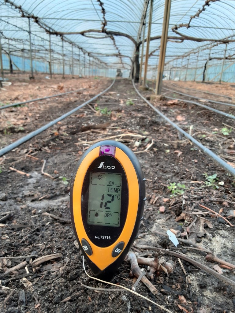今年は広いシャインマスカットのハウスで加温栽培はします。ハウスのサイドを閉めて10日間後から加温します。その間に地温が上がります。土壌が冷たいとぶどうの休眠が終わらない。
