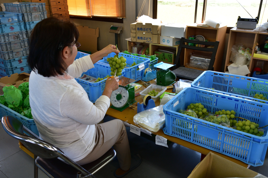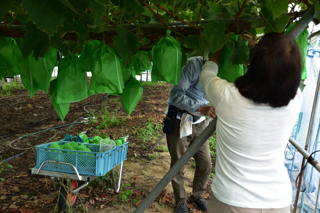 作業場で収穫量を計って選果をして袋詰めをしました。夫婦で退職され、奥さんが家でピオーネの木を育てています。二人ともシャインマスカット作りが楽しくて、頑張ってよくできました。自分で農業を始めた時を思い出しました。とても面白かったです。