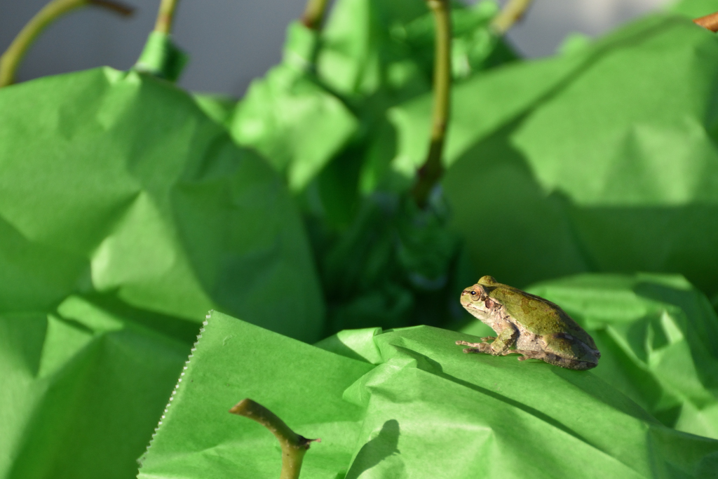 数日前の朝に収穫をした時にはトラックに載せたコンテナにアマガエルがいました。ハウスにカエルを戻しました。