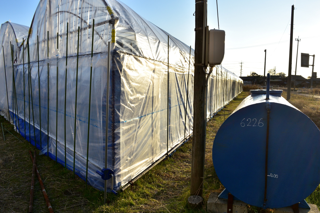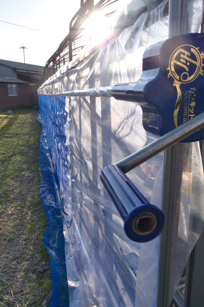 やればできるピカピカ巻き上げができました。一番難しいことはビニールの長さを合わせることです。方法は同じ長さで止める。測ったサイドの短いところの長さを真ん中から外までパッカーで止めることです。ビニール張りの前に作ります。上のビニールはサイドと一緒に止めます。