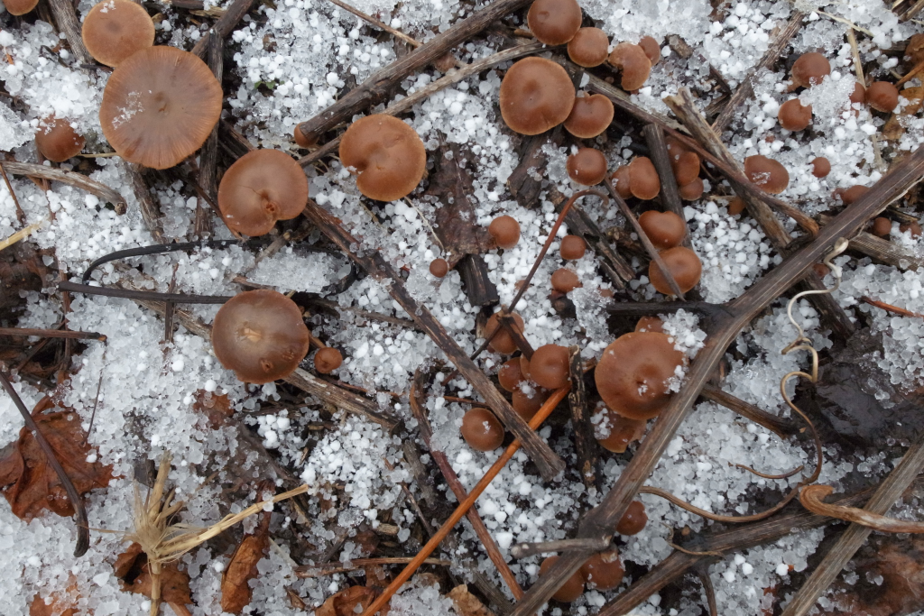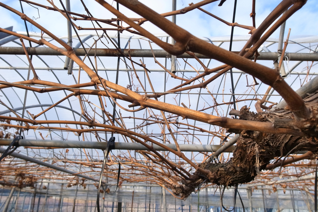 加温と無加温栽培のシャインマスカットの作業が進むと雨よけ栽培のシャインマスカットの剪定をします。朝が寒かったが風が無くて良かったです。前の日の雪がまだありました。