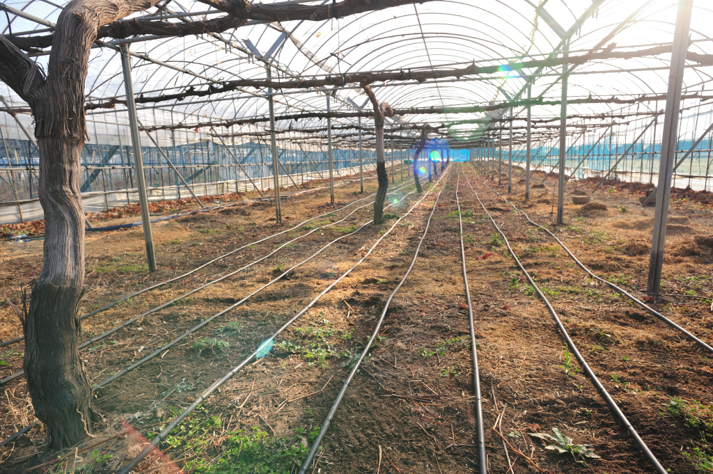 ブドウハウスの周りの網を一年中を使います。網は防虫と防鳥になります。雨よけ栽培シャインマスカットのハウスの網が古くなって交換しました。交換のときに見たのは谷の上が土が溜まって芽が出ました。自然の力が強いです。