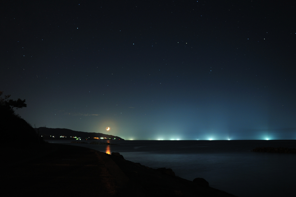 秋の空がきれいです。娘が星がすきですので近くの海までに空を見に行きました。月が海に落ちました。沢山ぎ漁船の光もありまし。