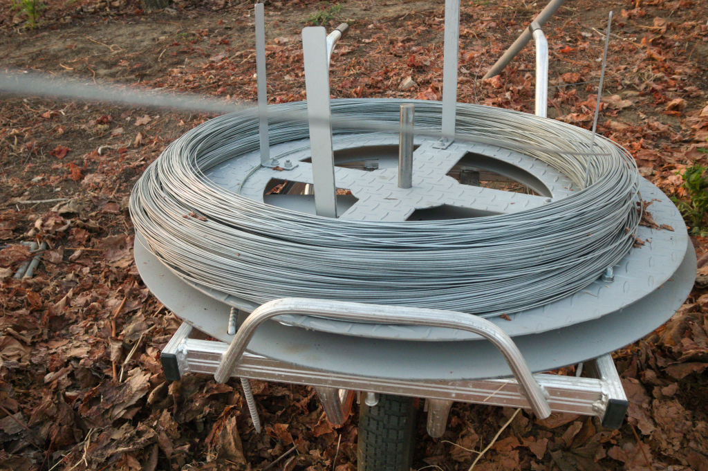 近くにある鉄工所で半鋼線の台を作ってもらいました。半鋼線を引っ張ると台の上部が回ります。タンーテーブル見たい。社長さんもブドウを作っているのですぐ分かりました。台を荷車に乗せて動かせます。台も重たいです。最初は線を引っ張りながら線を上げましたが後は線を地面の上に出してから棚に上げました。そっちのほうが早いです。