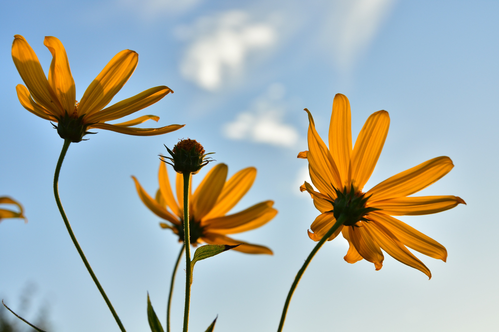 2日に沢山の黄色い花を見ました。青い空と綺麗です。昼頃は街の中。