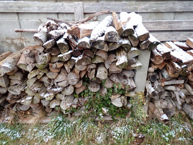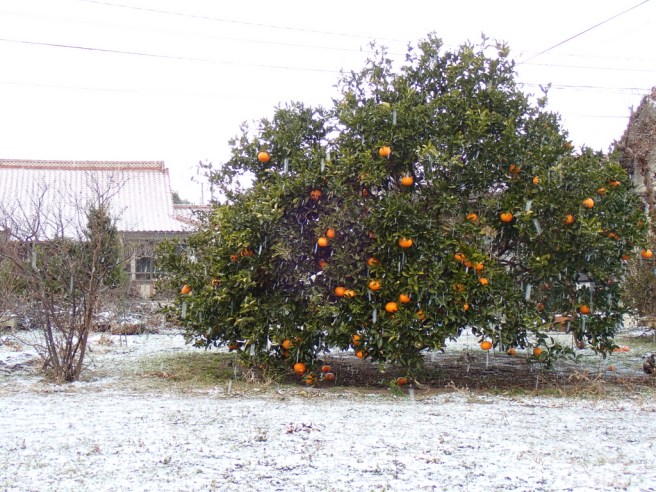 数日前に寒くなってまた雪が降りました。今年は春がなかなか来ないようです。雨よけ栽培のシャインマスカットのハウスの前にミカンの木があります。下の写真は2月下旬に雪が降った時のものです。それが最後の雪だと思っていました。