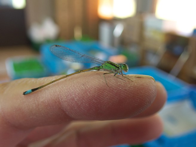 最近は一人で調整作業をしています。前日の朝日はイトトンボが作業場にいました。窓から出しました。