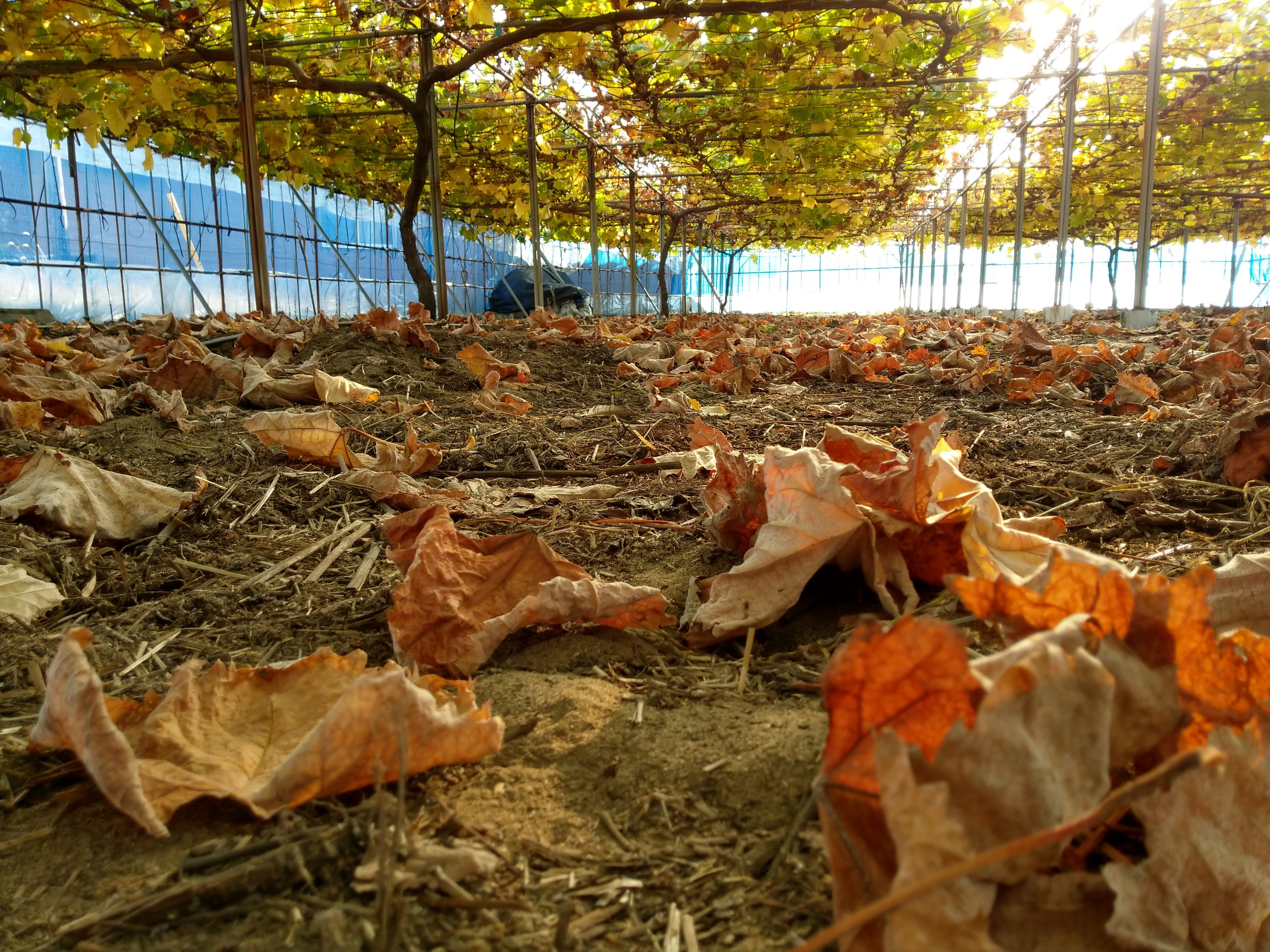 最近は気温が下がりました、ブドウの葉が落ちます。畑かんを使ってかん水するハウスがあります。11月16日から30日までは畑かんが使えないです。