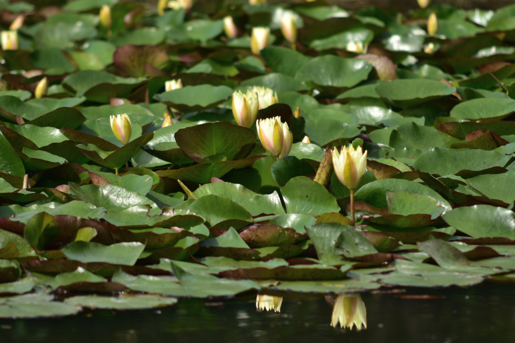 雨よけ栽培のシャインマスカットのハウスの近くに小さい公園があります。池の中のスイレンが咲いています。