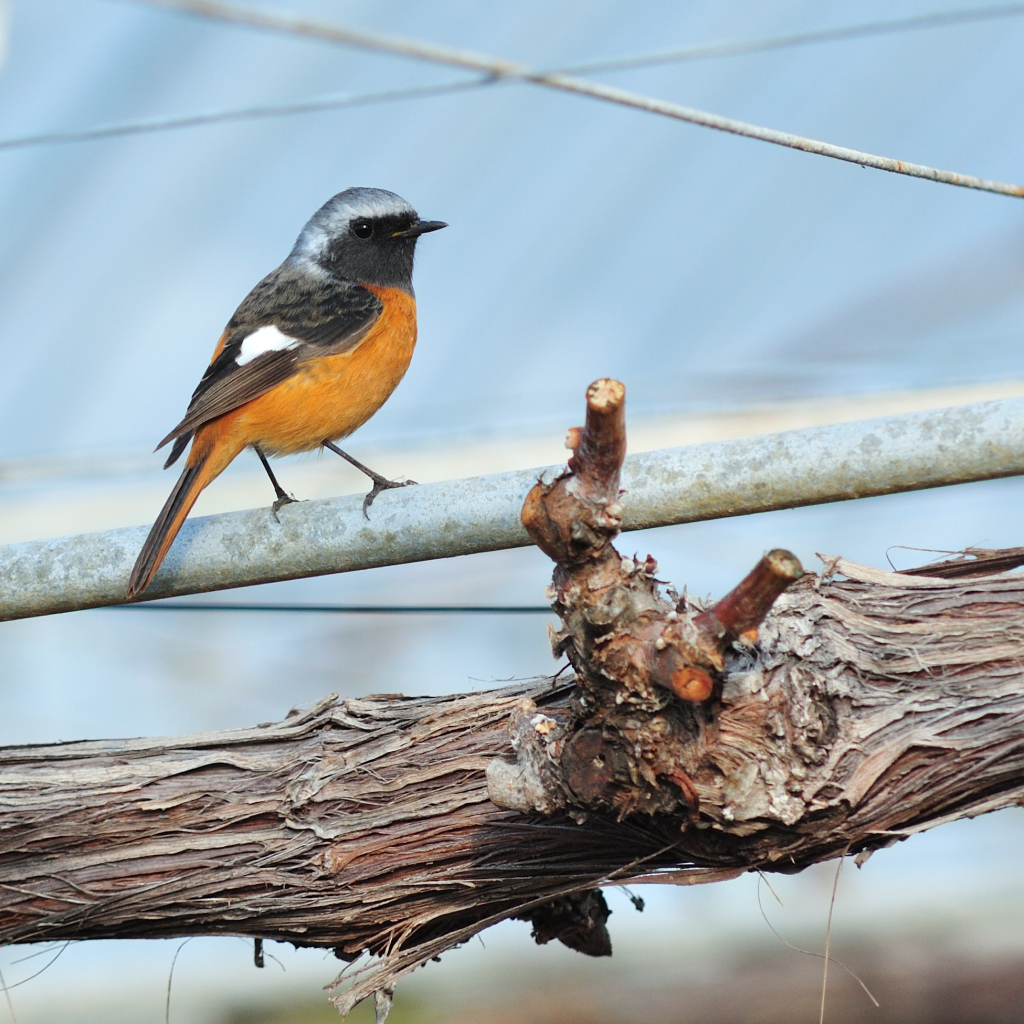 雨よけ栽培のシャインマスカットの剪定作業をしています。今年もハウスにモズが入って獲物を狩りました。モズが木に止まって地面にいるバッタかカナヘビを探します。食べやすいのために取った獲物を棚線にさし込みます。