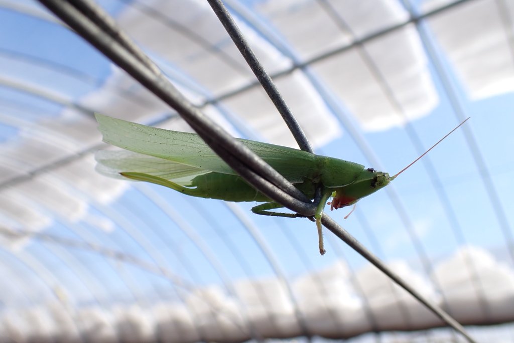 次の日モズはバッタとカナヘビを食べました。モズは他の野鳥よりハウスの出口が分かります。当日別のハウスに入っていたヒヨドリは中々出ることができませんでした。なので網を開けました。普通はハウスは開いてないです。どこから入るのでしょうか。