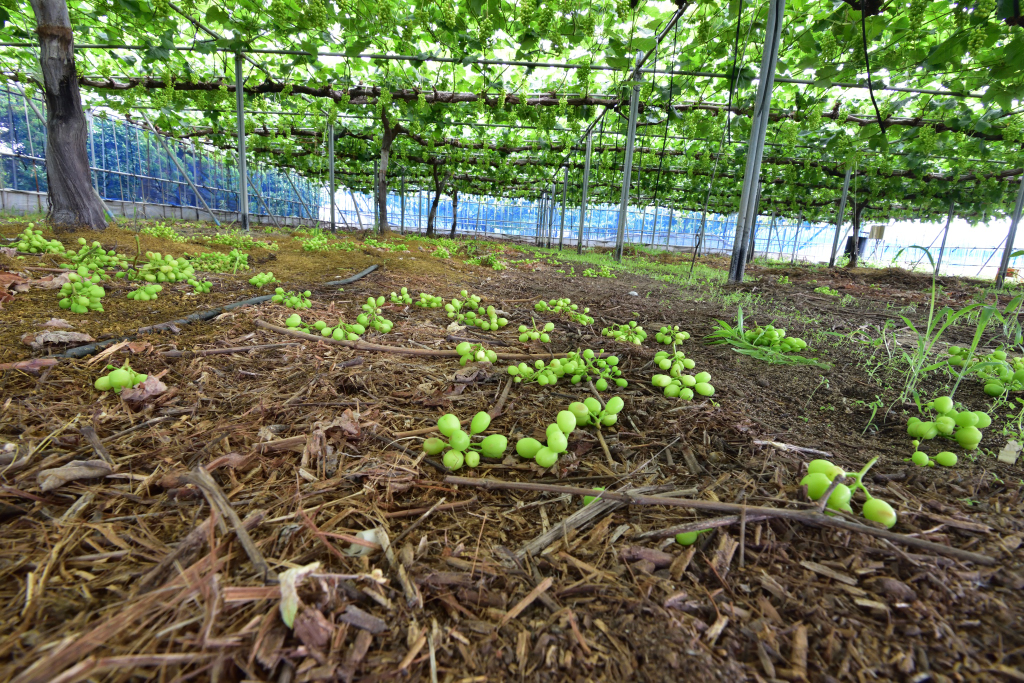 雨よけ栽培のシャインマスカットの畑の土壌改良をしました。堆肥、苦土石灰、と硫酸加里を撒いて一部をオーガーで穴を掘りました。作業をしていました時にハウスの網のスキマからモズが入りました。ハウスのパイプから虫を狩りました。モズはハウスの出口をよく分かっています。大体鳥がハウスに入っても出口が分からなくなります。